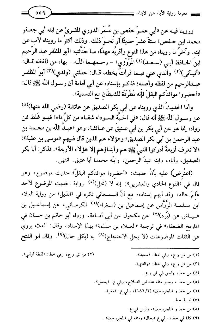 وروينا فيه عن "أبي عمر حفص بن عمر الدوري المقرىء عن ابنه أبي جعفر محمد ابن حفص" ستة عشر حديثا أو نحو ذلك. وذلك أكثر ما رويناه لأب عن ابنه. وآخر ما رويناه من هذا النوع وأقربه عهدا ما حدثنيه أبو المظفر عبد الرحيم ابن الحافظ أبي "سعد"1 المروزي رحمهما الله بها من "لفظه قال: أنبأني"2 والدي عني فيما قرأت بخطه قال حدثني "ولدي"3 أبو المظفر عبد الرحيم من لفظه وأصله فذكر بإسناده عن أبي أمامة أن رسول الله صلى الله عليه وسلم قال: "أحضروا موائدكم البقل فإنه مطردة للشيطان مع التسمية".
