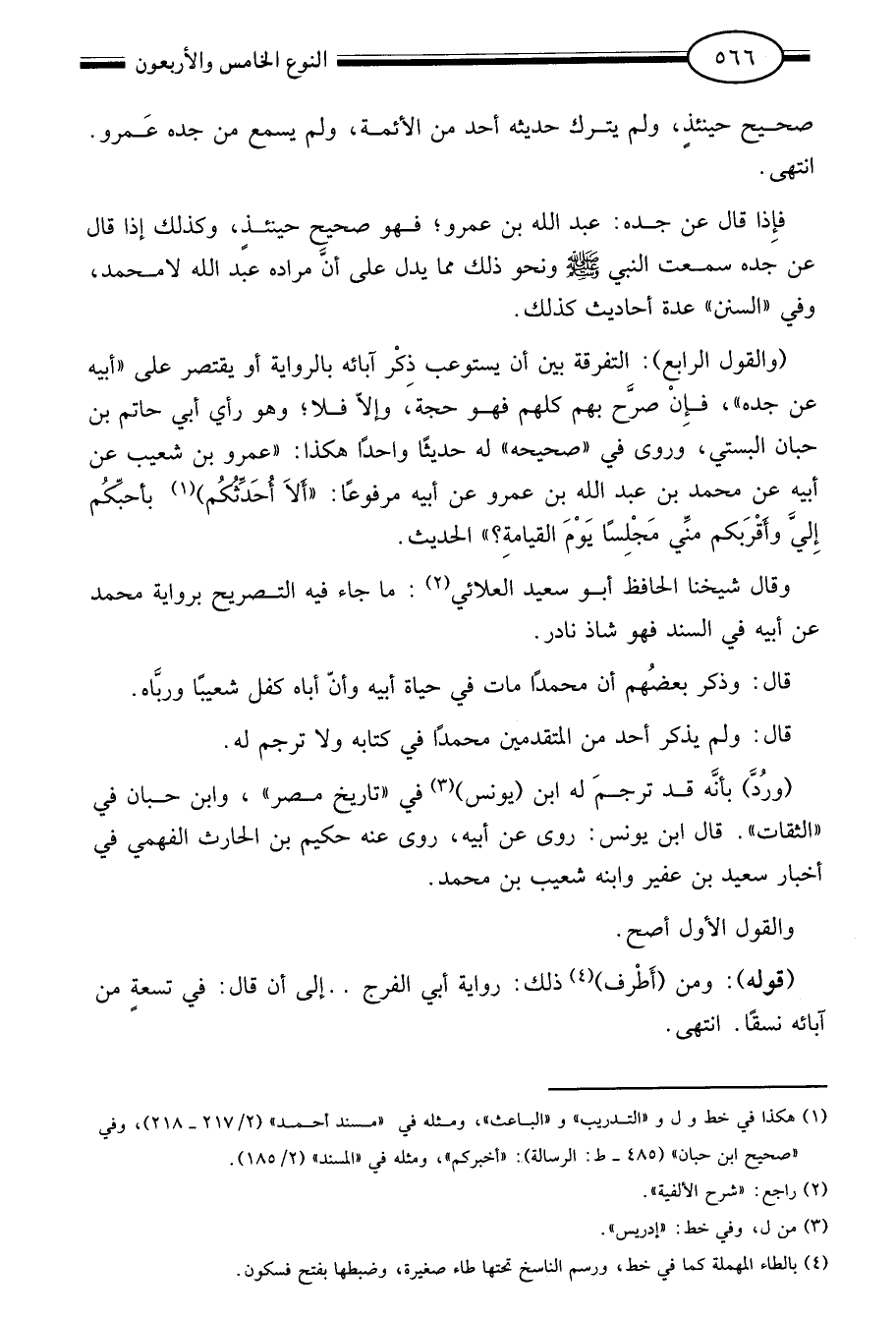 "والقول الرابع": التفرقة بين أن يستوعب ذكر آبائه بالرواية أو يقتصر على "أبيه عن جده" فإن صرح بهم كلهم فهو حجة وإلا فلا وهو رأي أبي حاتم بن حبان البستي وروى في صحيحه له حديثا واحدا هكذا "عمرو بن شعيب عن أبيه عن محمد بن عبد الله بن عمرو عن أبيه مرفوعا: "ألا أحدثكم"1 بأحبكم إلي وأقربكم مني مجلسا يوم القيامة" الحديث.