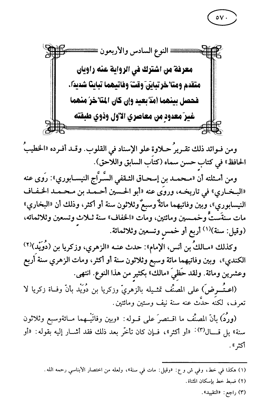 ومن أمثلته أن محمد بن إسحاق الثقفي السراج النيسابوري روى عنه البخاري في تاريخه وروى عنه أبو الحسين أحمد بن محمد الخفاف النيسابوري وبين وفاتيهما مائة وسبع وثلاثون سنة أو أكثر وذلك أن البخاري مات سنة ست وخمسين ومائتين ومات الخفاف سنة ثلاث وتسعين وثلاثمائة "وقيل: سنة"1 أربع أو خمس وتسعين وثلاثمائة.