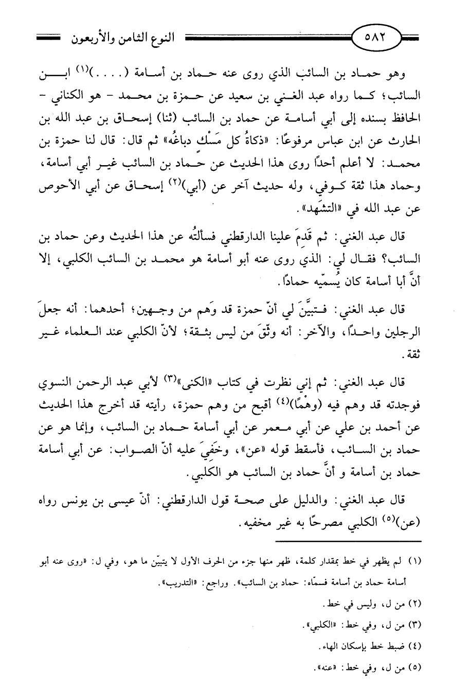 قال عبد الغني: ثم إني نظرت في كتاب "الكنى"3 لأبي عبد الرحمن النسوي فوجدته قد وهم فيه "وهما"4 أقبح من وهم حمزة رأيته قد أخرج هذا الحديث عن أحمد بن علي عن أبي معمر عن أبي أسامة حماد بن السائب وإنما هو عن حماد بن السائب فأسقط قوله عن وخفي عليه أن الصواب عن أبي أسامة حماد بن أسامة وأن حماد بن السائب هو الكلبي.