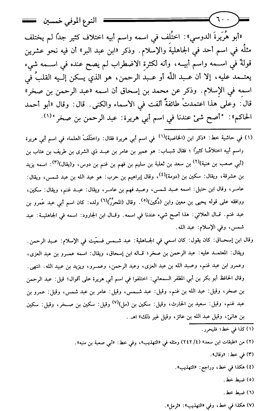 1 في الحاشية خط: "ذكر ابن "الخاضبة" "1" في اسم أبي هريرة فقال: واختلف العلماء في اسم أبي هريرة واسم أبيه اختلافا كثيرا، فقال شباب: هو عمير بن عامر بن عبد ذي الشرى بن طريف بن عتاب بن "أبي صعب بن هنية" "2" بن سعد بن ثعلبة بن سليم بن فهد بن غنم بن دوس، و"يقال" "3": اسمه يزيد بن عشرقة، ويقال: سكين بن دومه "4"، وقال إبراهيم بن حرب: هو عبد الله بن عبدشمس، ويقال: عامر، وقال ابن حنبل: اسمع عبد شمس، وعبد فهم بن عامر، ويقال: عبد غنم، ويقال: سكين، ووافقه علي قوله يحيى بن معين وابن "دكين" "5". وقال "المحرر" "6" ولده: كان اسم أبي عبد عمرو بن عبد غنم. قال العلائي: هذا أصح شيء عندنا في اسمه. وقال ابن الجارود: أسمه في الجاهلية: عبد شمس، وفي الإسلام: عبد الله.