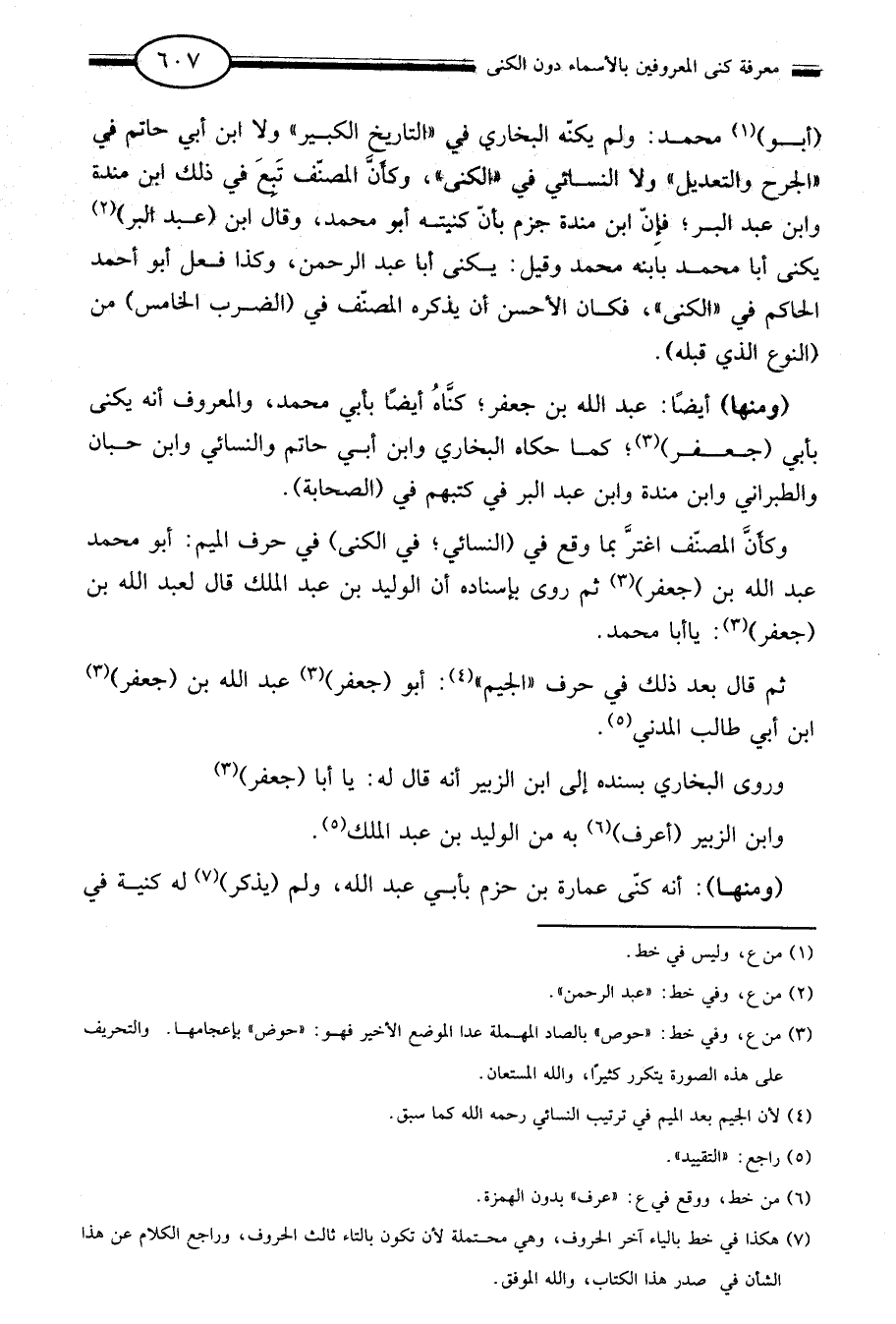 "ومنها" أيضا: عبد الله بن جعفر كناه أيضا بأبي محمد والمعروف أنه يكنى بأبي "جعفر"3 كما حكاه البخاري وابن أبي حاتم والنسائي وابن حبان والطبراني وابن مندة وابن عبد البر في كتبهم في الصحابة.