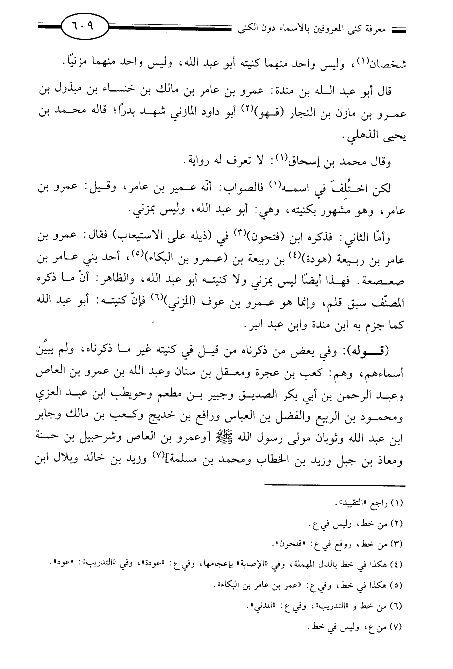 وأما الثاني: فذكره ابن "فتحون"3 في ذيله على الاستيعاب فقال عمرو بن عامر بن ربيعة "هودة"4 بن ربيعة بن "عمرو بن البكاء"5 أحد بني عامر بن صعصعة. فهذا أيضا ليس بمزني ولا كنيته أبو عبد الله والظاهر: أن ما ذكره المصنف سبق قلم وإنما هو عمرو بن عوف "المزني"6 فإن كنيته: أبو عبد الله كما جزم به ابن مندة وابن عبد البر.