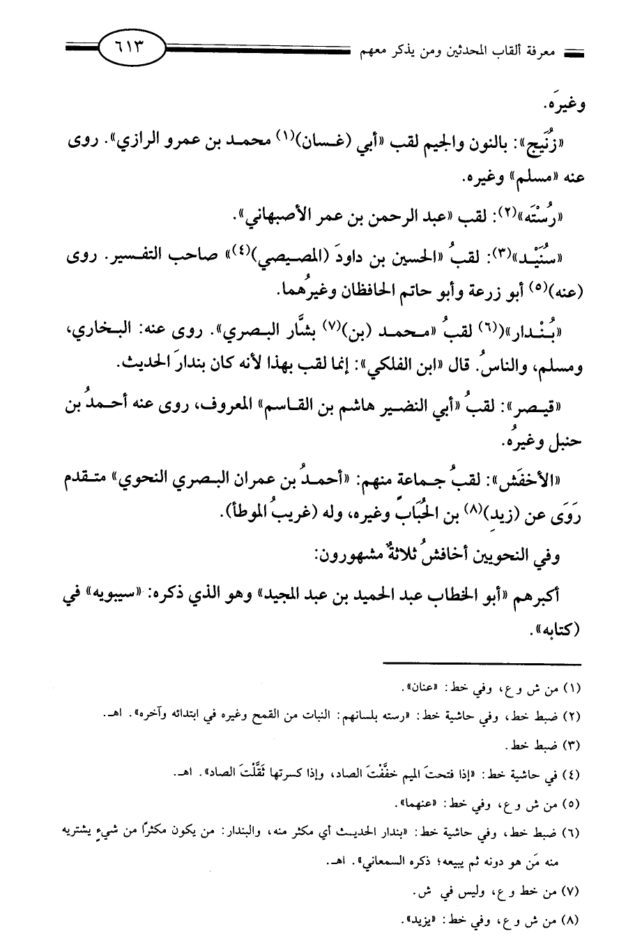 "سنيد"3: لقب الحسين بن داود "المصيصي"4 صاحب التفسير روى "عنه"5 أبو زرعة وأبو حاتم الحافظان وغيرهما.