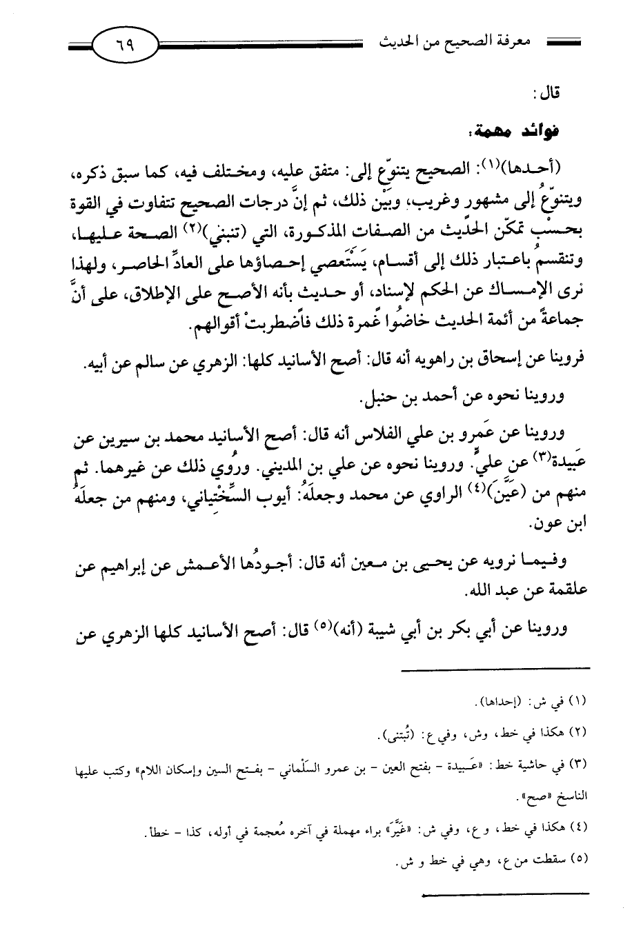 أحدها 1: الصحيح يتنوع إلى متفق عليه ومختلف فيه كما سبق ذكره ويتنوع إلى مشهور وغريب وبين ذلك ثم إن درجات الصحيح تتفاوت في القوة بحسب تمكن الحديث من الصفات المذكورة التي تنبني2 الصحة عليها وتنقسم باعتبار ذلك إلى أقسام يستعصى إحصاؤها على العاد الحاصر ولهذا نرى الإمساك عن الحكم لإسناد أو حديث بأنه الأصح على الإطلاق على أن جماعة من أئمة الحديث خاضوا غمرة ذلك فاضطربت أقوالهم. فروينا عن إسحاق بن راهويه أنه قال: أصح الأسانيد كلها الزهري عن سالم عن أبيه.