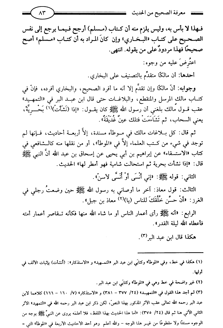 وجوابه: أن مالكا وإن تقدم إلا أنه ما أفرد الصحيح والبخاري أفرده فإن في كتاب مالك المرسل والمنقطع والبلاغات حتى قال: ابن عبد البر في التمهيد عقب قول مالك بلغني أن رسول الله صلى الله عليه وسلم- كان يقول "إذا نشأت1 بحرية يعني السحاب ثم تشاءمت فتلك عين غديقة.