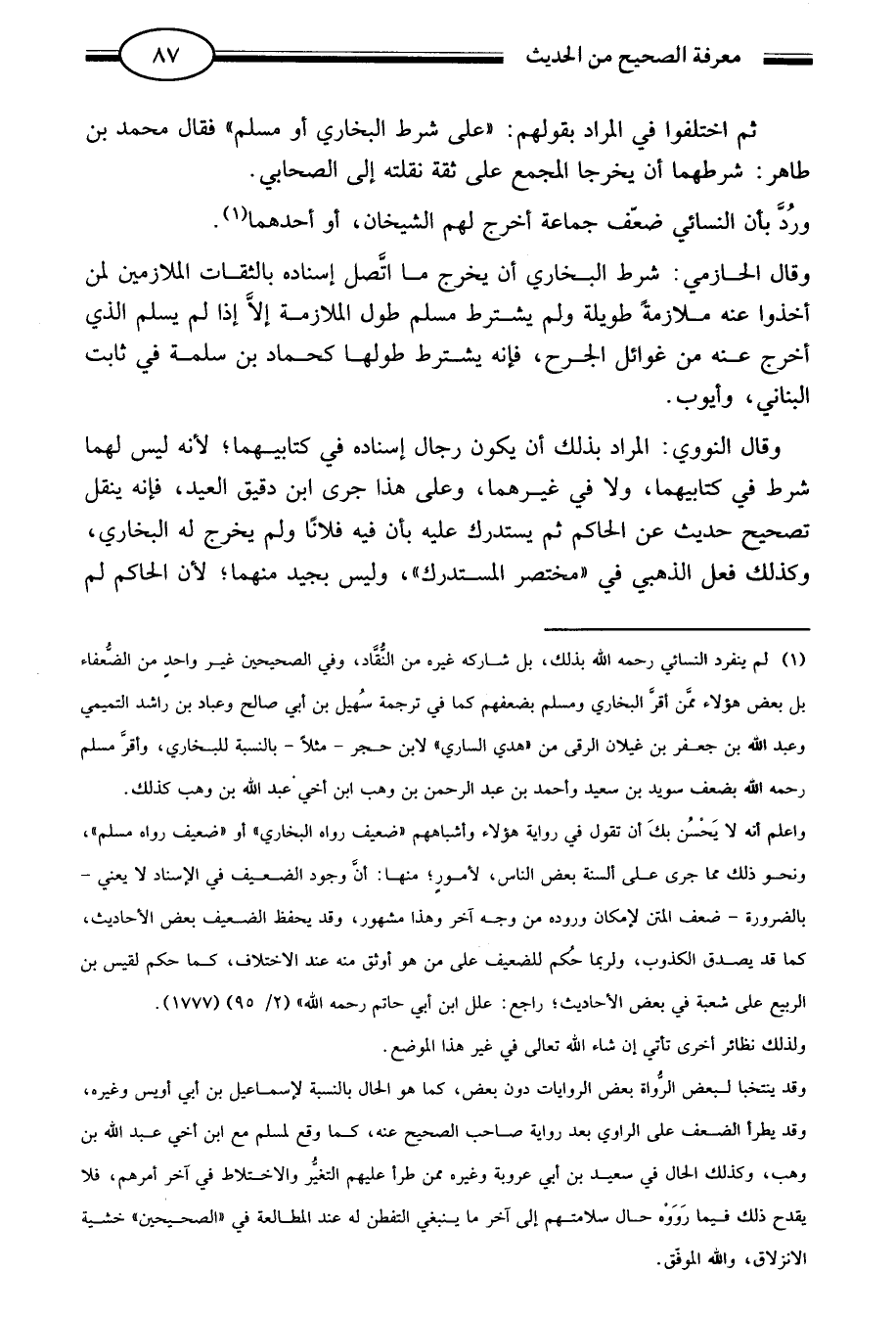 وقال الحازمي شرط البخاري أن يخرد ما اتصل إسناده بالثقات الملازمين لمن أخذوا عنه ملازمة طويلة ولم يشترط مسلم طول الملازمة إلا إذا لم يسلم الذي أخرج عنه من غوائل الجرح فإنه يشترط طولها كحماد بن سلمة في ثابت البناني وأيوب.