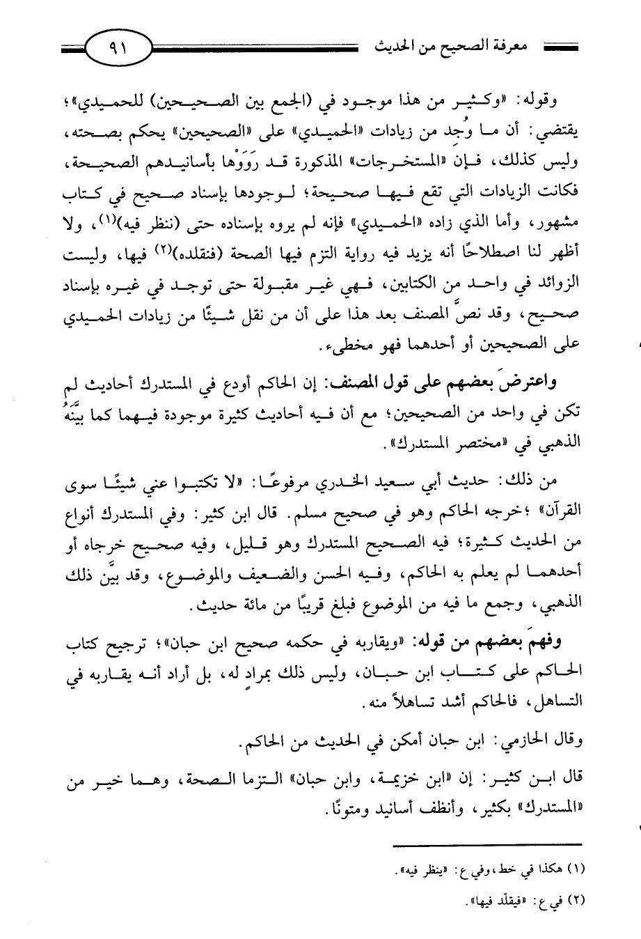 وقوله: وكثير من هذا موجود في الجمع بين الصحيحين للحميدي يقتضي ان ما وجد من زيادات الحميدي على الصحيحين يحكم بصحته وليس كذلك فإن المستخرجات المذكورة قد رووها بأسانيدهم الصحيحة فكانت الزيادات التي تقع فيها صحيحة لوجودها بإسناد صحيح في كتاب مشهور وأما الذي زاده الحميدي فإنه لم يروه بإسناده حتى ننظر فيه1 ولا أظهر لنا اصطلاحا أنه يزيد فيه رواية التزم فيها الصحة فنقلده2 فيها وليست الزوائد في واحد من الكتابين فهي غير مقبولة حتى توجد في غيره بإسناد صحيح وقد نص المصنف بعد هذا على أن من نقل شيئا من زيادات الحميدي على الصحيحين أو أحدهما فهو مخطئ.
