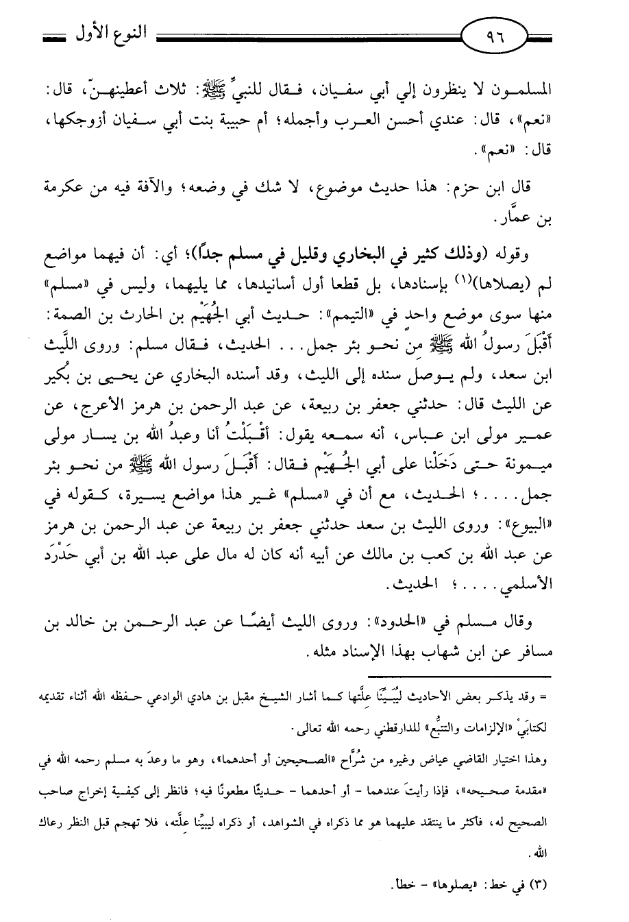 وقوله: وذلك كثير في البخاري وقليل في مسلم جدا أي أن فيهما مواضع لم يصلاها1 بإسنادها بل قطعا أول أسانيدها مما يليهما وليس في مسلم منها سوى موضع واحد في التيمم حديث أبي الجهيم بن الحارث بن الصمة أقبل رسول الله صلى الله عليه وسلم- من نحو بئر جمل الحديث فقال مسلم وروى الليث ابن سعد ولم يوصل سنده إلى الليث وقد أسنده البخاري عن يحيى بن بكير عن الليث قال: حدثني جعفر بن ربيعة عن عبد الرحمن بن هرمز الأعرج عن عمير مولى ابن عباس أنه سمعه يقول أقبلت أنا وعبد الله بن يسار مولى ميمونة حتى دخلنا على أبي الجهيم فقال أقبل رسول الله صلى الله عليه وسلم- من نحو بئر جمل الحديث مع أن في مسلم غير هذا مواضع يسيرة كقوله في البيوع وروى الليث بن سعد حدثني جعفر بن ربيعة عن عبد الرحمن بن هرمز عن عبد الله بن كعب بن مالك عن أبيه أنه كان له مال على عبد الله بن أبي حدرد الأسلمي الحديث.