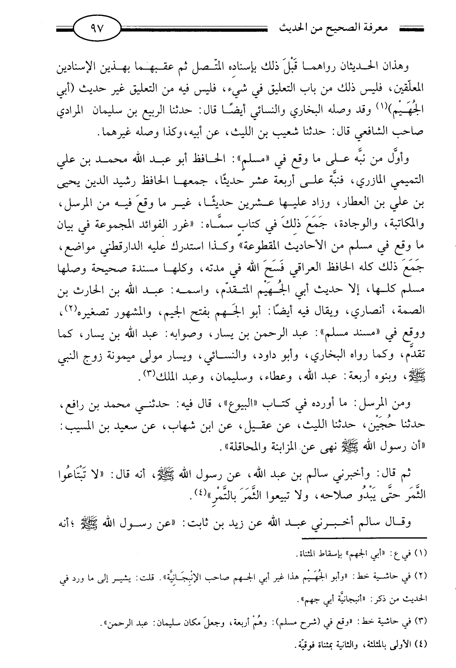 وأول من نبه على ما وقع في مسلم الحافظ أبو عبد الله محمد بن علي التميمي المازري فنبة على أربعة عشر حديثا جمعها الحافظ رشيد الدين يحيى بن علي بن العطار وزاد عليها عشرين حديثا غير ما وقع فيه من المرسل والمكاتبة والوجادة جمع ذلك في كتاب سماه غرر الفوائد المجموعة في بيان ما وقع في مسلم من الأحاديث المقطوعة وكذا استدرك عليه الدارقطني مواضع جمع ذلك كله الحافظ العراقي فسح الله في مدته وكلها مسندة صحيحة وصلها مسلم كلها إلا حديث أبي الجهيم المتقدم واسمه عبد الله بن الحارث بن الصمة أنصاري ويقال فيه أيضا أبو الجهم بفتح الجيم والمشهور تصغيره2 ووقع في مسند مسلم عبد الرحمن بن يسار وصوابه عبد الله بن يسار كما تقدم وكما رواه البخاري وأبو داود والنسائي ويسار مولى ميمونة زوج النبي صلي اله عليه وسلم وبنوه أربعة عبد الله وعطاء وسليمان وعبد الملك3.