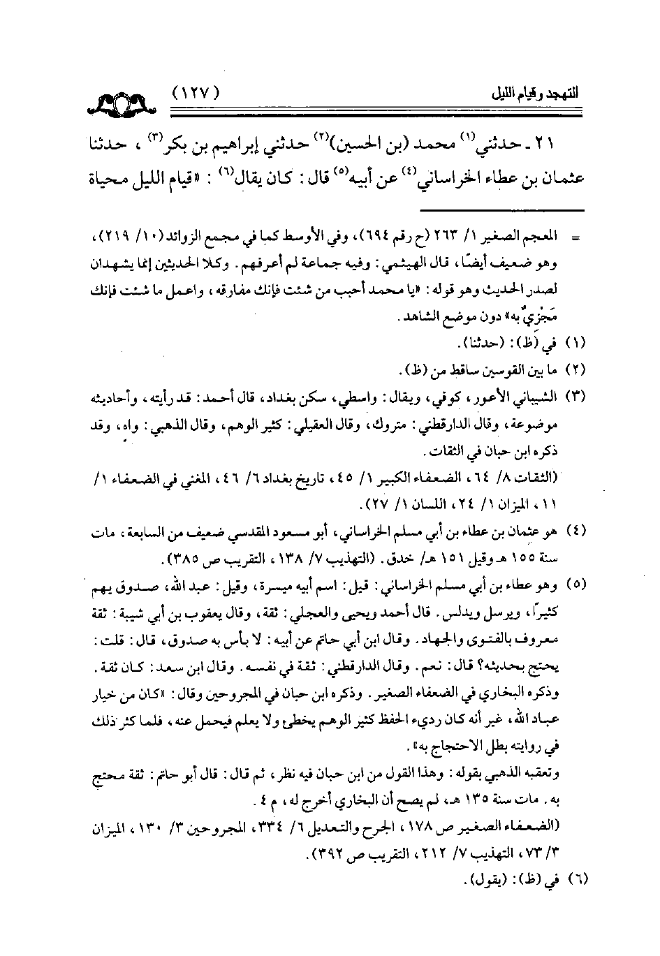 21 - حدثني محمد بن الحسين حدثني إبراهيم بن بكر حدثنا عثمان بن عطاء الخراساني عن أبيه قال كان يقال قيام الليل محياة