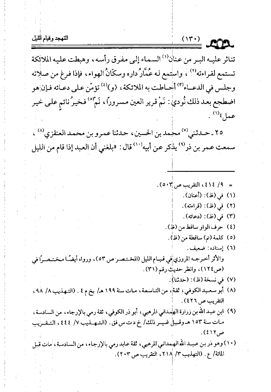 25 - حدثني محمد بن الحسين حدثنا عمرو بن محمد العنقزي سمعت عمر بن ذر يذكر عن أبيه قال بلغني أن العبد إذا قام من الليل