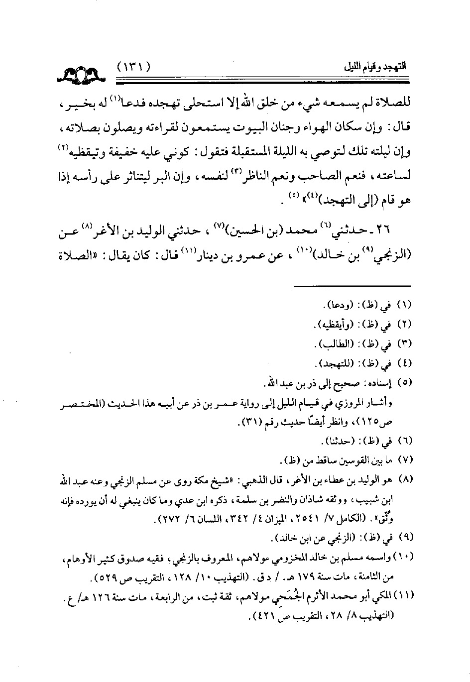 26 - حدثني محمد بن الحسين حدثني الوليد بن الأغر عن الزنجي بن خالد عن عمرو بن دينار قال كان يقال الصلاة