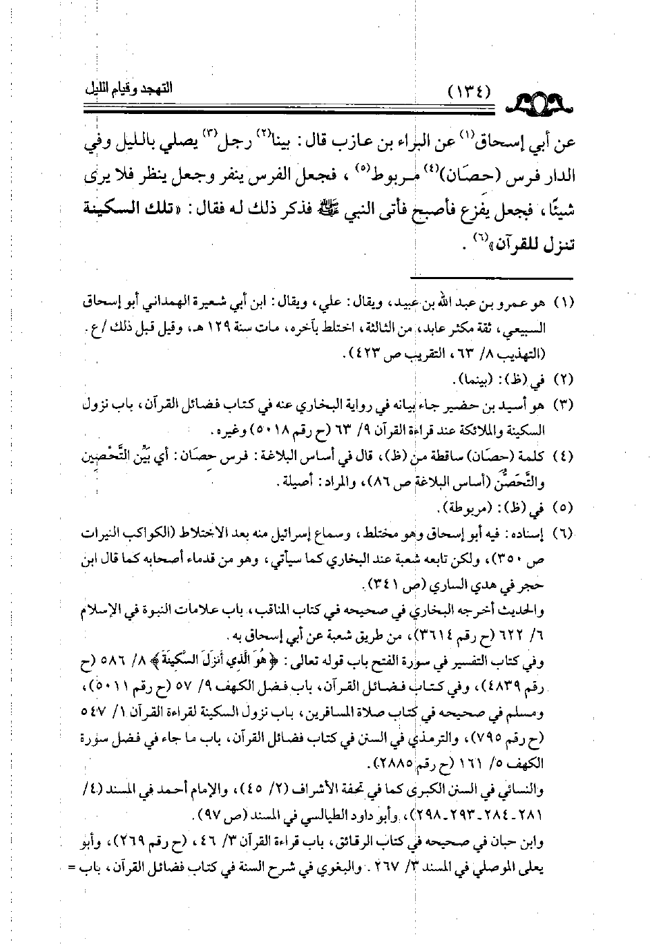 عن أبي إسحاق عن البراء بن عازب قال بينا رجل يصلي بالليل وفي الدار فرس حصان مربوط فجعل الفرس ينفر وجعل ينظر فلا يرى شيئا فجعل يفزع فأصبح فأتى النبي فذكر ذلك له فقال ( تلك السكينة تنزل للقرآن ) // إسناده فيه أبو إسحاق وهو مختلط //