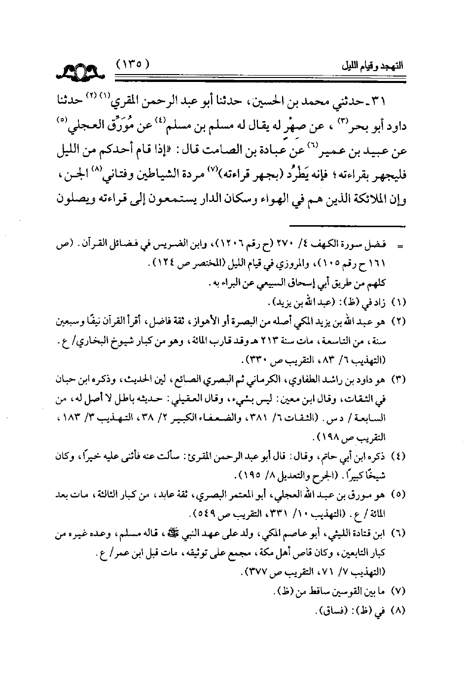 31 - حدثني محمد بن الحسين حدثنا أبو عبد الرحمن المقرئ حدثنا داود أبو بحر عن صهر يقال له مسلم بن مسلم عن مورق العجلي عن عبيد بن عمير عن عبادة بن الصامت قال إذا قام أحدكم من الليل فليجهر بقراءته فإنه يطرد بجهر قراءته مردة الشياطين وفتاني الجن وإن الملائكة الذين هم في الهواء وسكان الدار يستمعون إلى قراءته ويصلون