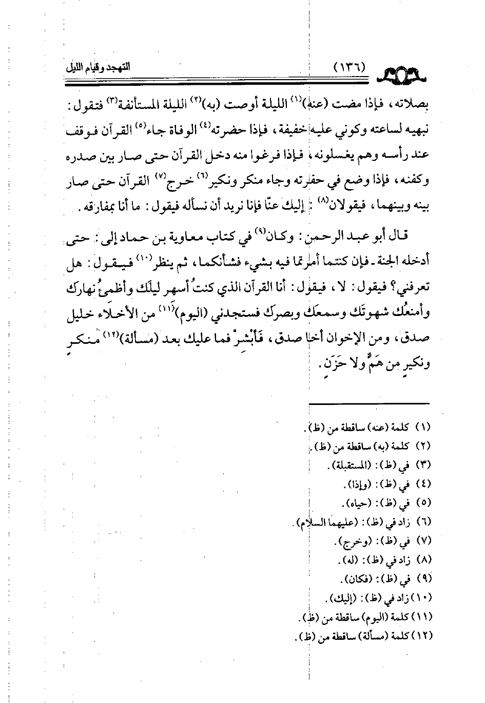 بصلاته فإذا مضت عنه ساعة الليلة أوصت به الليلة المستأنفة فتقول نبهيه لساعته وكوني عليه خفيفة فإذا حضرته الوفاة جاء القرآن فوقف عند رأسه وهم يغسلونه فإذا فرغوا منه دخل القرآن حتى صار بين صدره وكفنه فإذا وضع في حفرته وجاء منكر ونكير خرج القرآن حتى صار بينه وبينهما فيقولان إليك عنا فإنا نريد أن نسأله فيقول ما أنا بمفارقه