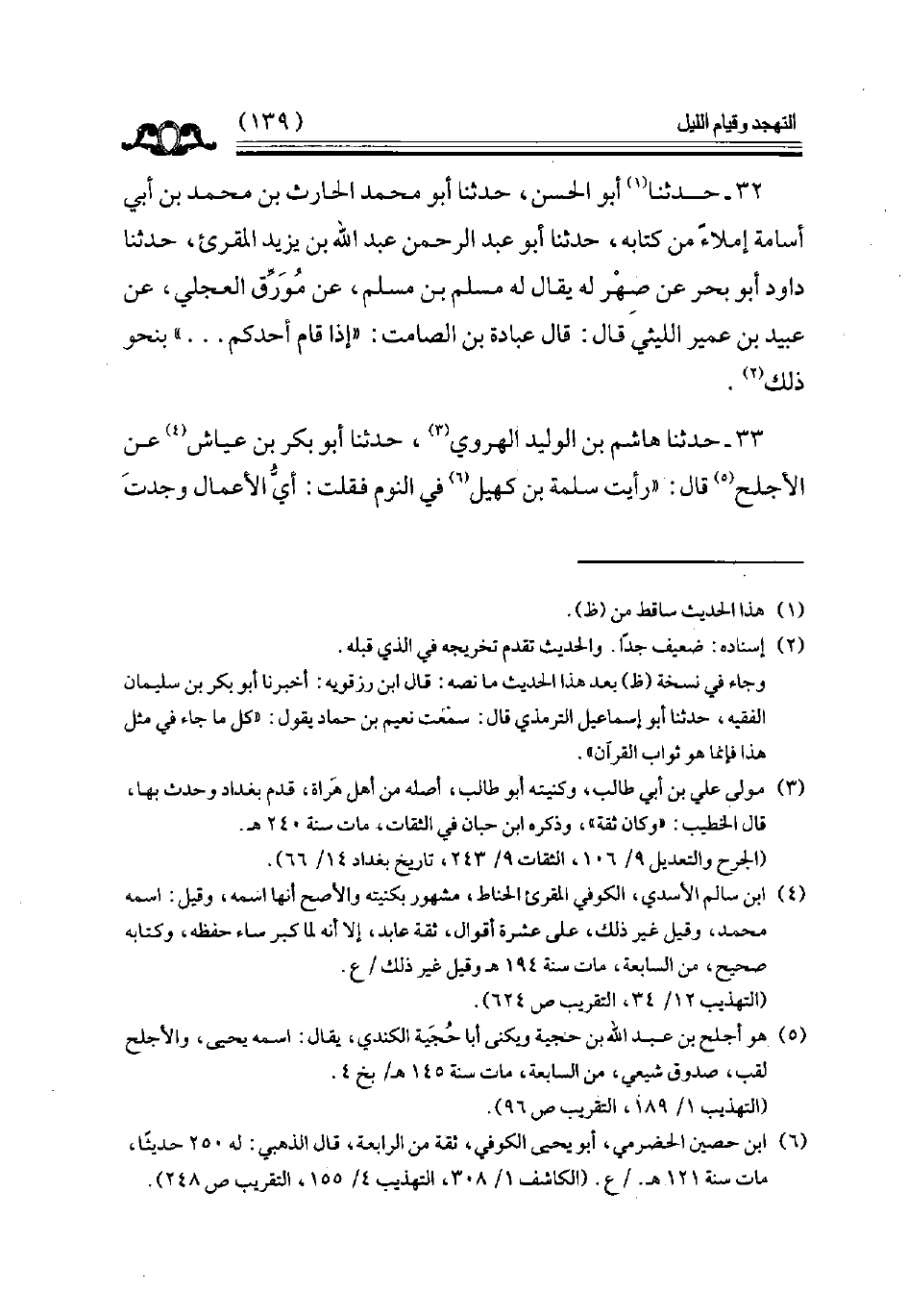 33 - حدثنا هاشم بن الوليد الهروي حدثنا أبو بكر بن عياش عن الأجلح قال رأيت سلمة بن كهيل في النوم فقلت أي الأعمال وجدت