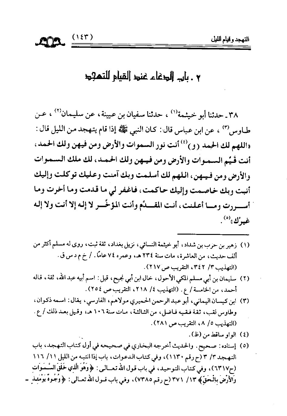 38 - حدثنا أبو خيثمة حدثنا سفيان بن عيينة عن سليمان عن طاوس عن ابن عباس قال كان النبي إذا قام يتهجد من الليل قال (اللهم لك الحمد وأنت نور السموات والأرض ومن فيهن ولك الحمد أنت قيم السموات والأرض ومن فيهن ولك الحمد لك ملك السماوات والأرض ومن فيهن اللهم لك أسلمت وبك آمنت وعليك توكلت وإليك أنبت وبك خاصمت وإليك حاكمت فاغفر لي ما قدمت وما أخرت وما أسررت وما أعلنت أنت المقدم وأنت المؤخر لا إله إلا أنت ولا إله غيرك) // إسناده صحيح //