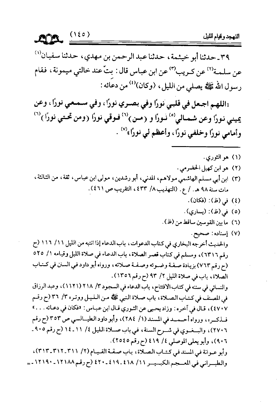 39 - حدثنا أبو خيثمة حدثنا عبد الرحمن بن مهدي حدثنا سفيان عن سلمة عن كريب عن ابن عباس قال بت عند خالتي ميمونة فقام رسول الله يصلي من الليل وكان من دعائه