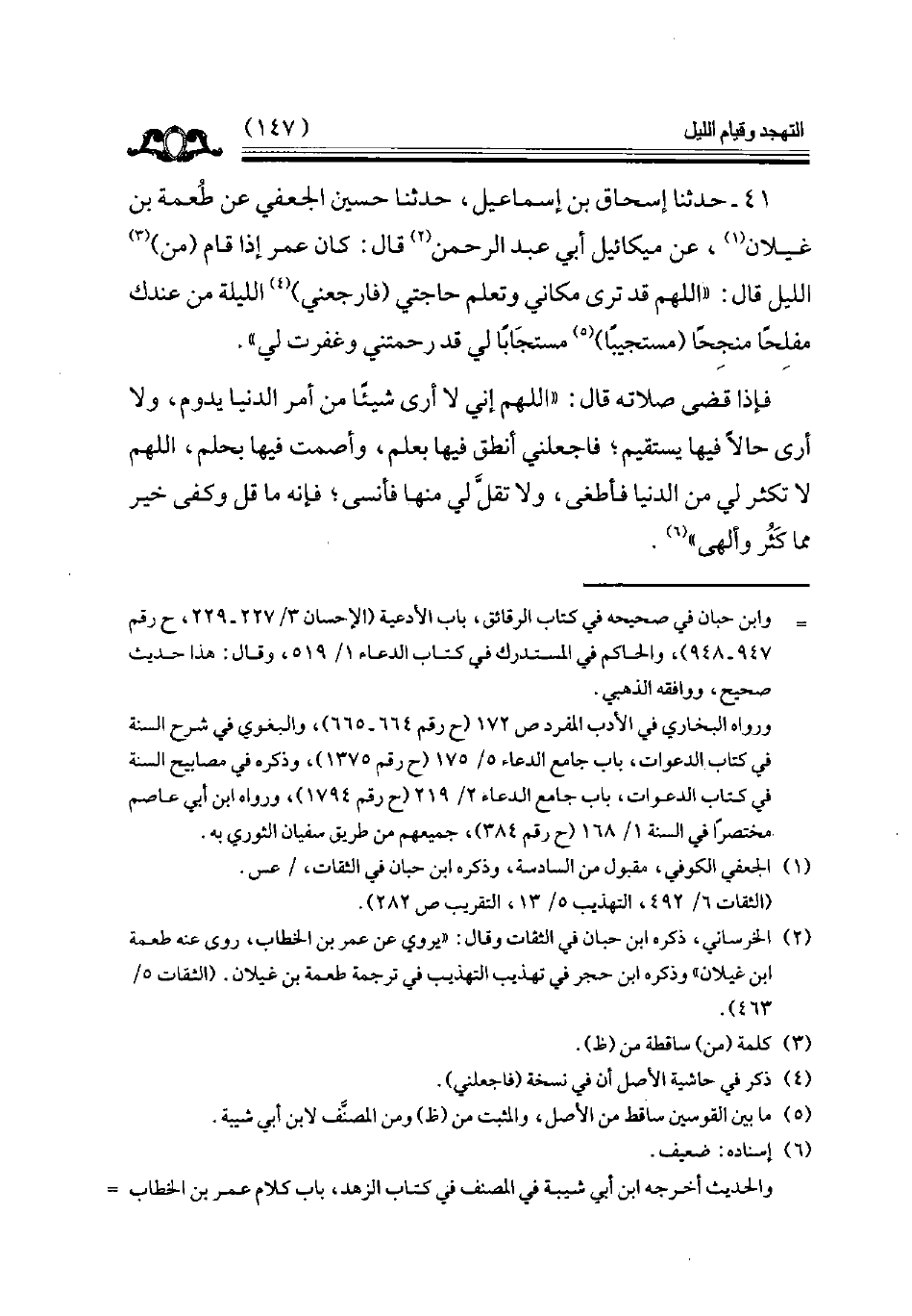 41 - حدثنا إسحاق بن إسماعيل حدثنا حسين الجعفي عن طعمة بن غيلان عن ميكائيل أبي عبد الرحمن قال كان عمر إذا قام من الليل قال اللهم قد ترى مكاني وتعلم حاجتي فارجعني الليلة من عندك مفلحا منجحا مستجيبا مستجابا لي قد رحمتني وغفرت لي