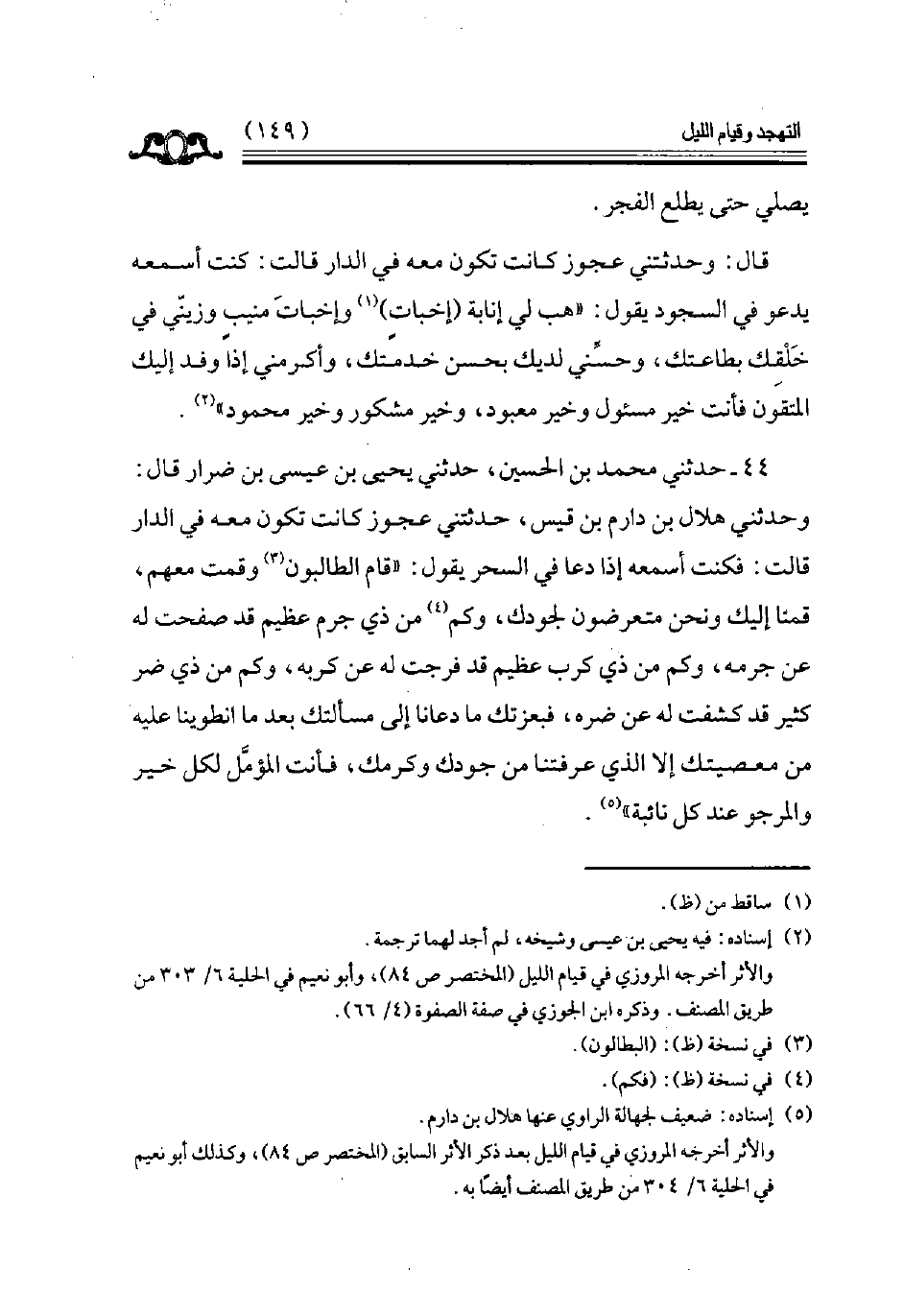 44 - حدثني محمد بن الحسين حدثني يحيى بن عيسى بن ضرار قال وحدثني هلال بن دارم بن قيس حدثتني عجوز كانت تكون معه في الدار قالت فكنت أسمعه إذا دعا في السحر يقول قام الطالبون وقمت معهم قمنا إليك ونحن متعرضون لجودك وكم من ذي جرم عظيم قد صفحت له عن جرمه وكم من ذي كرب عظيم قد فرجت له عن كربه وكم من ذي ضر كثير قد كشفت له عن ضره فبعزتك ما دعانا إلى مسألتك بعد ما انطوينا عليه من معصيتك إلا الذي عرفتنا من جودك وكرمك فأنت المؤمل لكل خير والمرجو عند كل نائبة // إسناده ضعيف //