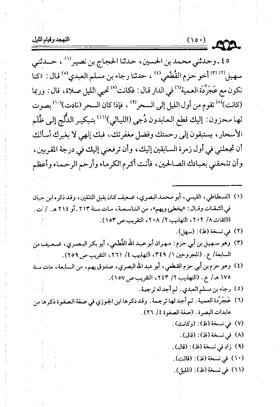 45 - وحدثني محمد بن الحسين حدثنا الحجاج بن نصير حدثني سهيل أخو حزم القطعي حدثنا رجاء بن مسلم العبدي قال كنا نكون مع عجرده العمية في الدار قال فكانت تحيي الليل صلاة قال وربما كانت تقوم من أول الليل إلى السحر فإذا كان السحر نادت بصوت لها محزون إليك قطع العابدون دجى الليالي بتبكير الدلج إلى ظلم الأسحار يستبقون إلى رحمتك وفضل مغفرتك فبك إلهي لا بغيرك أسألك أن تجعلني في أول زمرة السابقين إليك وان ترفعني إليك في درجة المقربين وان تلحقني بعبادك الصالحين فأنت أكرم الكرماء وأرحم الرحماء وأعظم