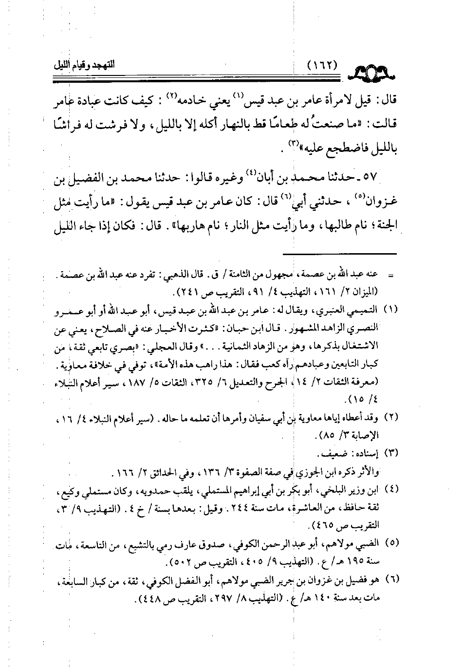 قال قيل لامرأة عامر بن عبد قيس يعني خادمه كيف كانت عبادة عامر قالت ما صنعت له طعاما قط بالنهار أكله إلا بالليل ولا فرشت له فراشا بالليل فاضطجع عليه // إسناده ضعيف //