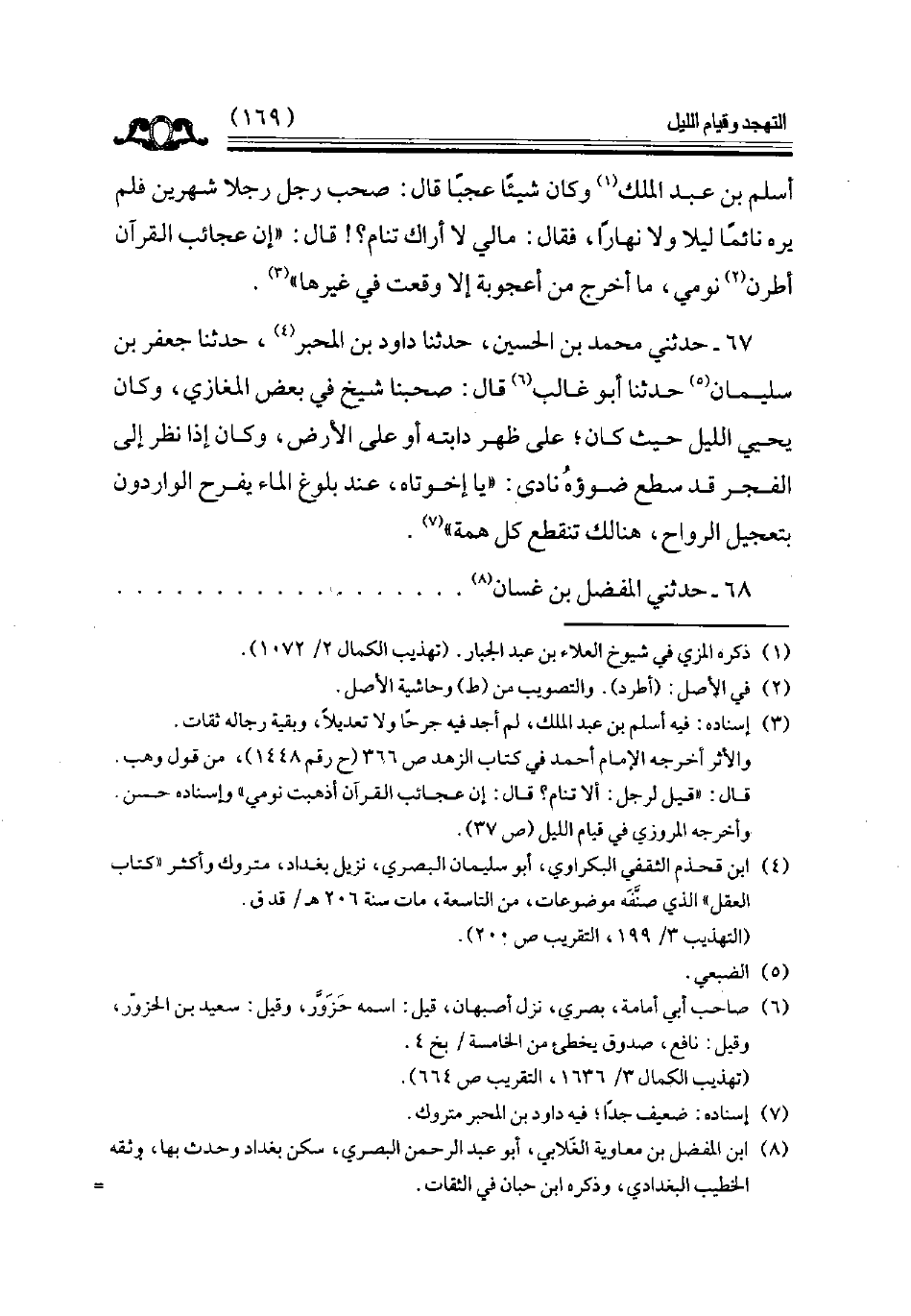 67 - حدثني محمد بن الحسين حدثنا داود بن المحبر حدثنا جعفر بن سليمان حدثنا أبو غالب قال صحبنا شيخ في بعض المغازي وكان يحيي الليل حيث كان على ظهر دابته أو على الأرض وكان إذا نظر إلى الفجر قد سطع ضوؤه نادى يا إخوتاه عند بلوغ الماء يفرح الواردون بتعجيل الرواح هنالك تنقطع كل همة