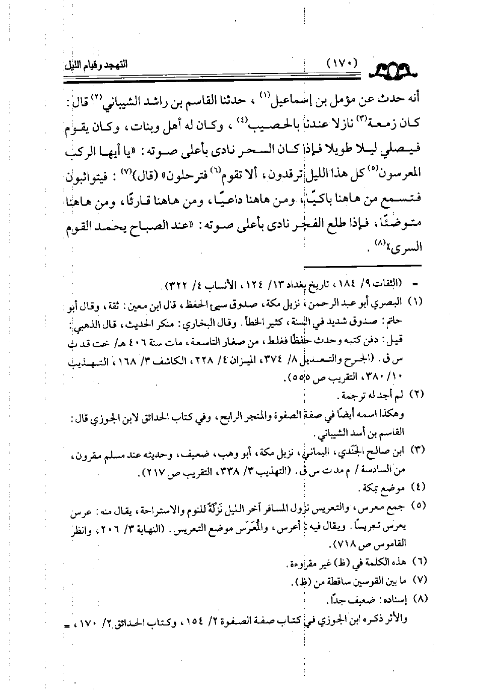 أنه حدث عن مؤمل بن إسماعيل حدثنا القاسم بن راشد الشيباني قال كان زمعة نازلا عندنا بالحصيب وكان له أهل وبنات وكان يقوم فيصلي ليلا طويلا فإذا كان السحر نادى بأعلى صوته يا أيها الركب المعرسون كل هذا الليل ترقدون ألا تقوم فترحلون قال فيتواثبون فتسمع من هاهنا باكيا ومن هاهنا داعيا ومن هاهنا قارئا ومن هاهنا متوضئا فإذا طلع الفجر نادى بأعلى صوته عند الصباح يحمد القوم السرى