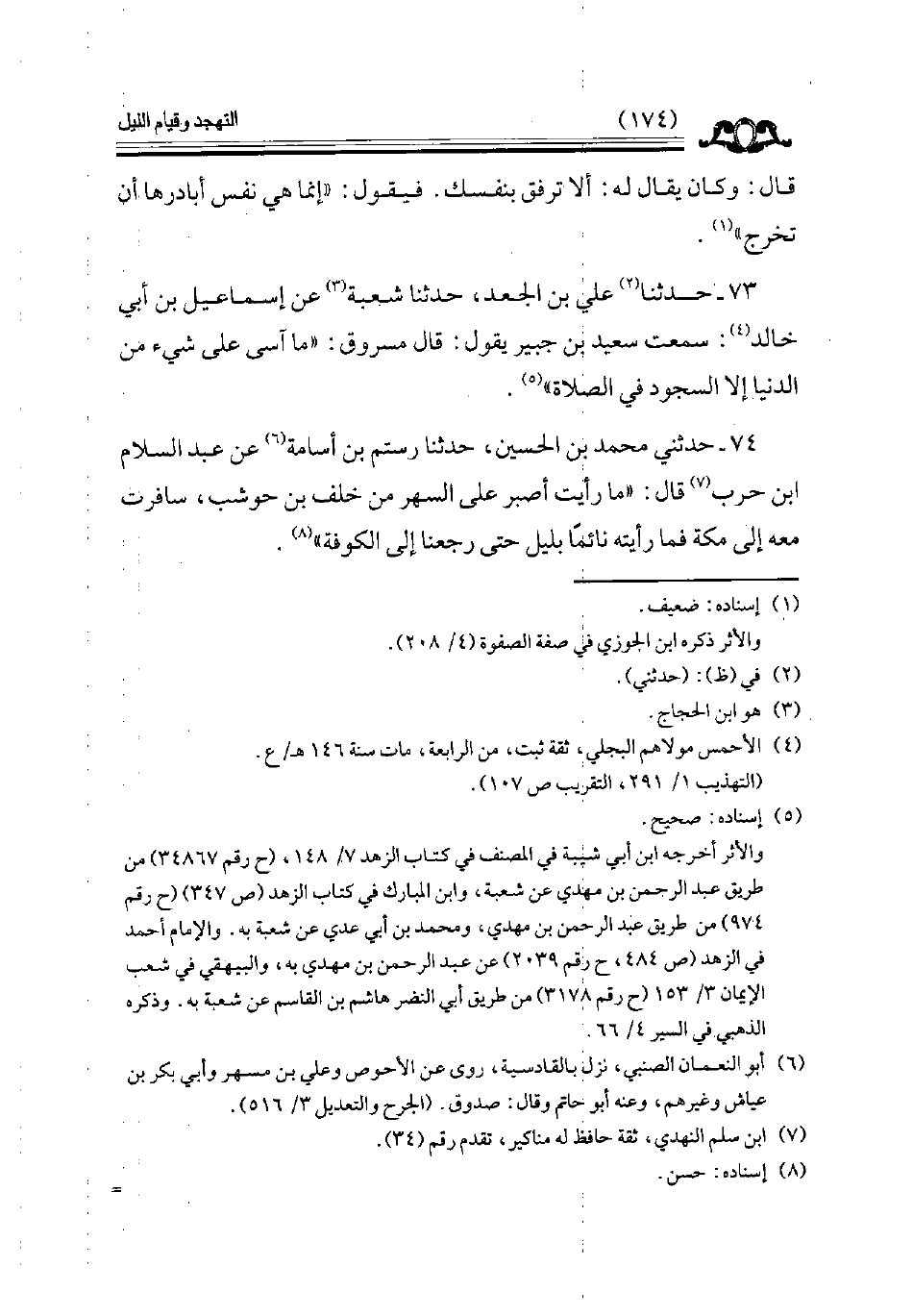 74 - حدثني محمد بن الحسين حدثنا رستم بن أسامه عن عبد السلام بن حرب قال ما رأيت أصبر على السهر من خلف بن حوشب سافرت معه إلى مكة فما رأيته نائما بليل حتى رجعنا إلى الكوفة