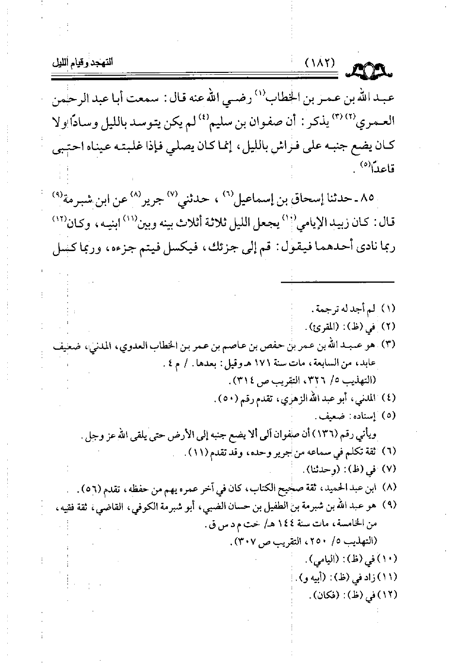 85 - حدثنا إسحاق بن إسماعيل حدثني جرير عن ابن شبرمة قال كان زبيد الإيامي يجعل الليل ثلاثة أثلاث بينه وبين ابنيه وكان ربما نادى أحدهما فيقول قم إلى جزئك فيكسل فيتم جزءه وربما كسل