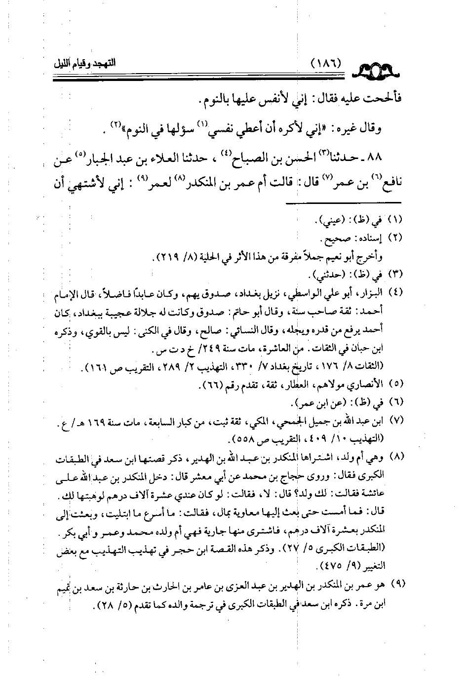 88 - حدثنا الحسن بن الصباح حدثنا العلاء بن عبد الجبار عن نافع بن عمر قال قالت أم عمر بن المنكدر لعمر إني لأشتهي أن