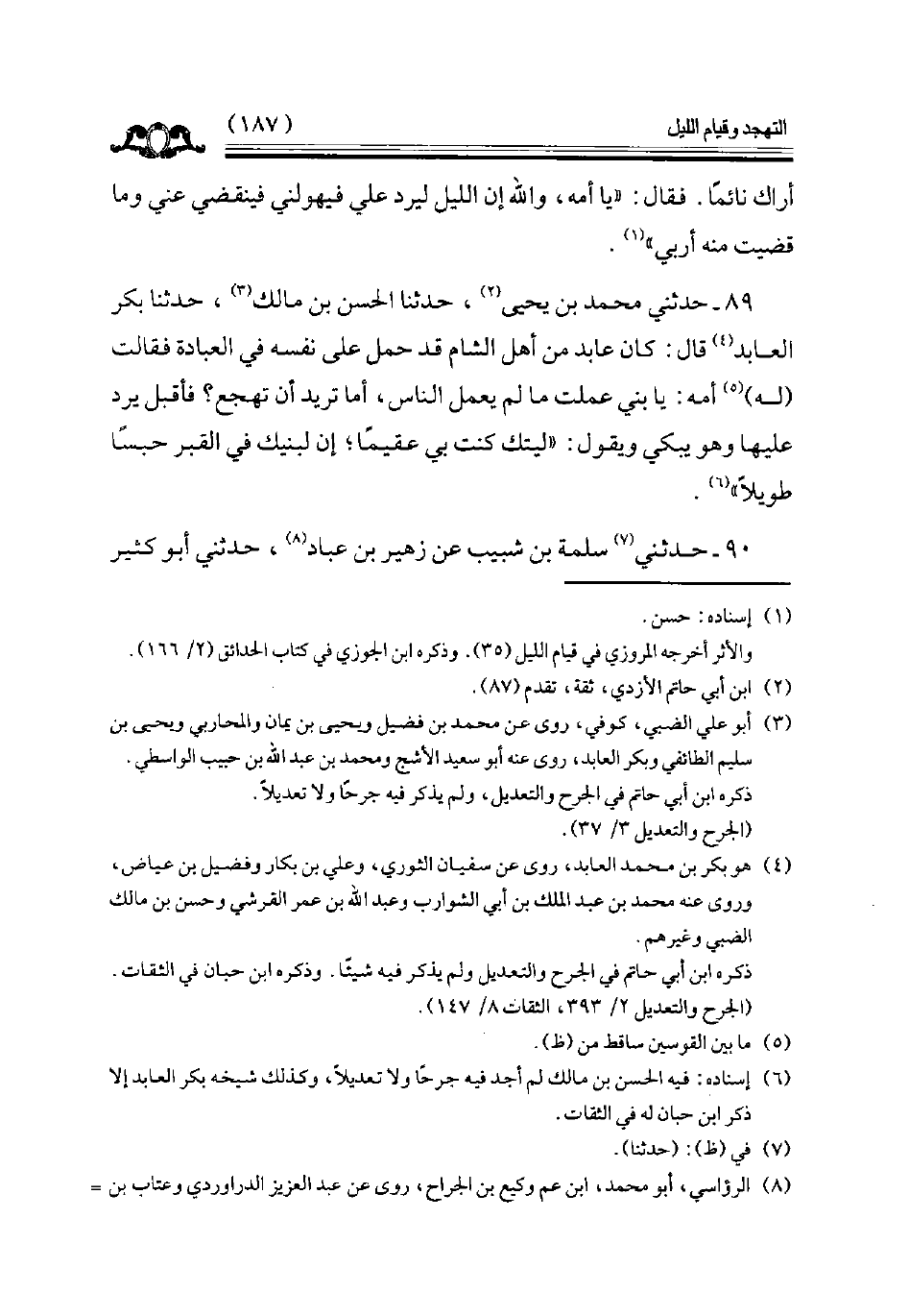 89 - حدثني محمد بن يحيى حدثنا الحسن بن مالك حدثنا بكر العابد قال كان عابد من أهل الشام قد حمل على نفسه في العبادة فقالت له أمه يا بني عملت ما لم يعمل الناس أما تريد أن تهجع فأقبل يرد عليها وهو يبكي ويقول ليتك كنت بي عقيما إن لبنيك في القبر حبسا طويلا