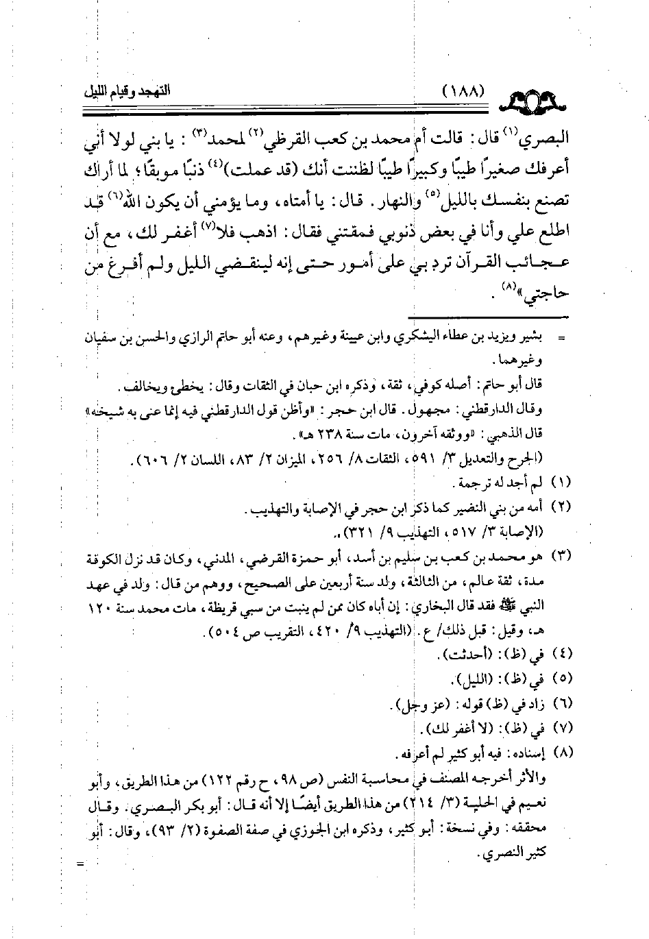 البصري قال قالت أم محمد بن كعب القرظي لمحمد يا بني لولا أني أعرفك صغيرا طيبا وكبيرا طيبا لظننت أنك قد عملت ذنبا موبقا لما أراك تصنع بنفسك بالليل والنهار قال يا أمتاه وما يؤمني أن يكون الله قد اطلع علي وأنا في بعض ذنوبي فمقتني فقال اذهب فلا أغفر لك مع أن عجائب القرآن ترد بي على أمور حتى إنه لينقضي الليل ولم أفرغ من حاجتي