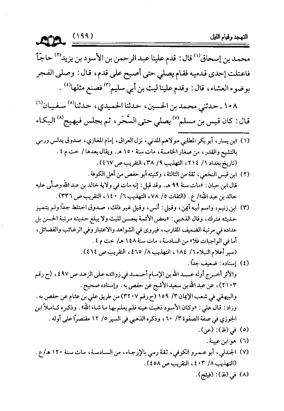 108 - حدثني محمد بن الحسين حدثنا الحميدي حدثنا سفيان قال كان قيس بن مسلم يصلي حتى السحر ثم يجلس فيهيج البكاء