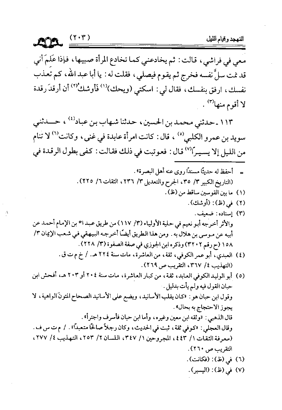 113 - حدثني محمد بن الحسين حدثنا شهاب بن عباد حدثني سويد بن عمرو الكلبي قال كانت امرأة عابدة في غنى وكانت لا تنام من الليل إلا يسيرا قال فعوتبت في ذلك فقالت كفى بطول الرقدة في