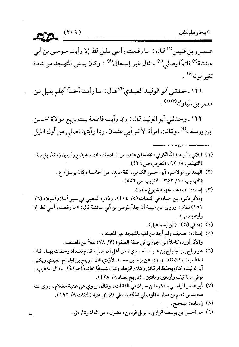 121 - حدثني أبو الوليد العبدي قال ما رأيت أحدا أعلم بليل من معمر بن المبارك // إسناده صحيح //