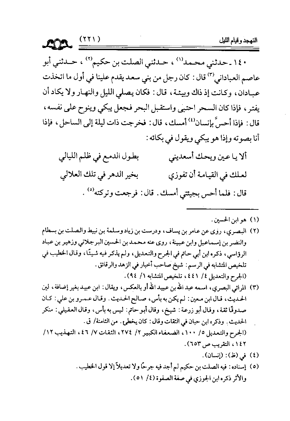 140 - حدثني محمد حدثني الصلت بن حكيم حدثني أبو عاصم العباداني قال كان رجل من بني سعد يقدم علينا في أول ما اتخذت عبادان وكانت إذ ذاك وبيئة قال فكان يصلي الليل والنهار ولا يكاد أن يفتر فإذا كان السحر احتبى واستقبل البحر فجعل يبكي وينوح على نفسه قال فإذا أحس بإنسان أمسك قال فخرجت ذات ليلة إلى الساحل فإذا أنا بصوته وإذا هو يبكي ويقول في بكائه