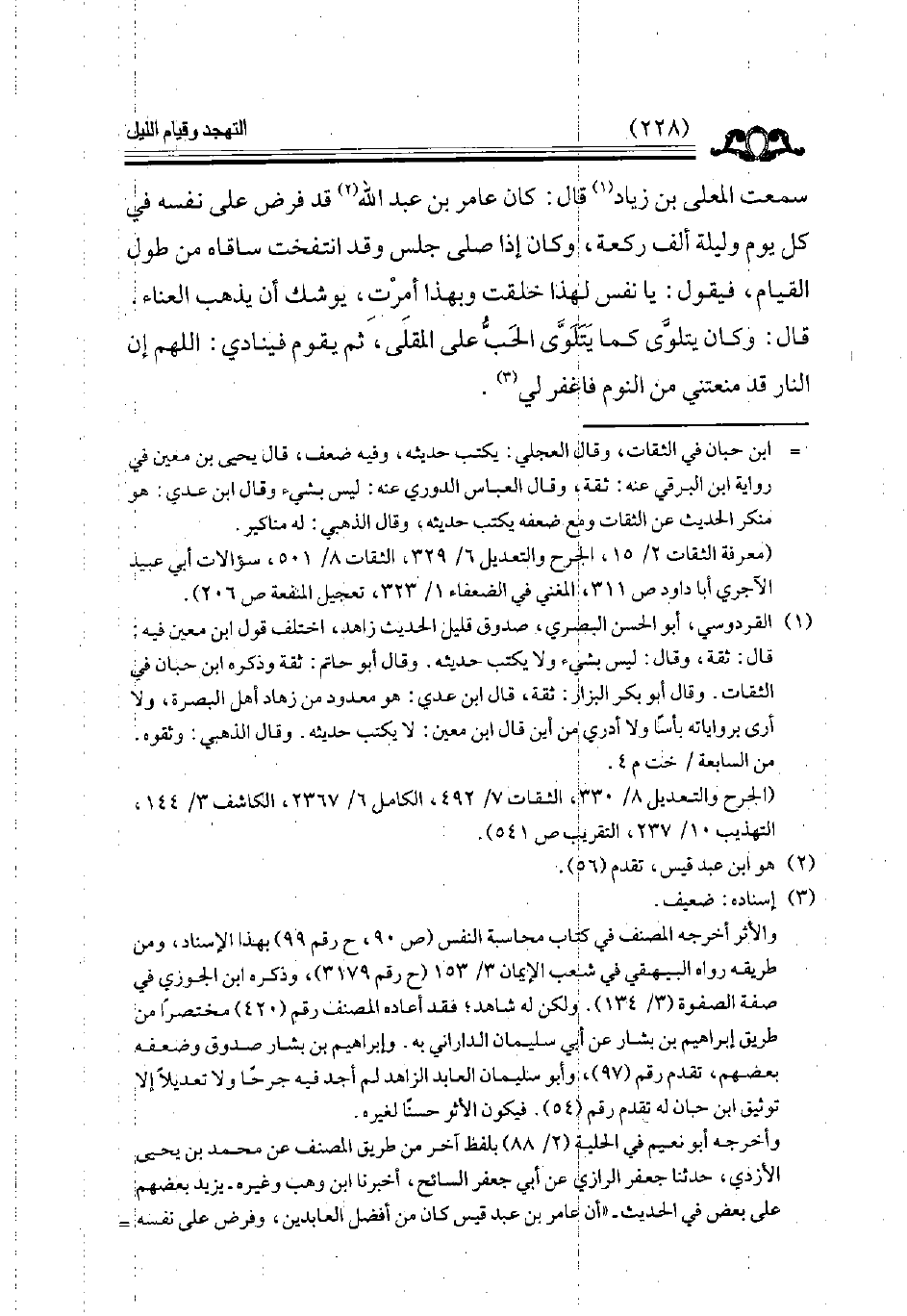 سمعت المعلي بن زياد قال كان عامر بن عبد الله قد فرض على نفسه في كل يوم وليلة ألف ركعة وكان إذا صلى جلس وقد انتفخت ساقاه من طول القيام فيقول يا نفس لهذا خلقت وبهذا أمرت يوشك أن يذهب العناء قال وكان يتلوى كما يتلوى الحب على المقلى ثم يقول فينادي اللهم إن النار قد منعتني من النوم فاغفر لي // إسناده ضعيف //