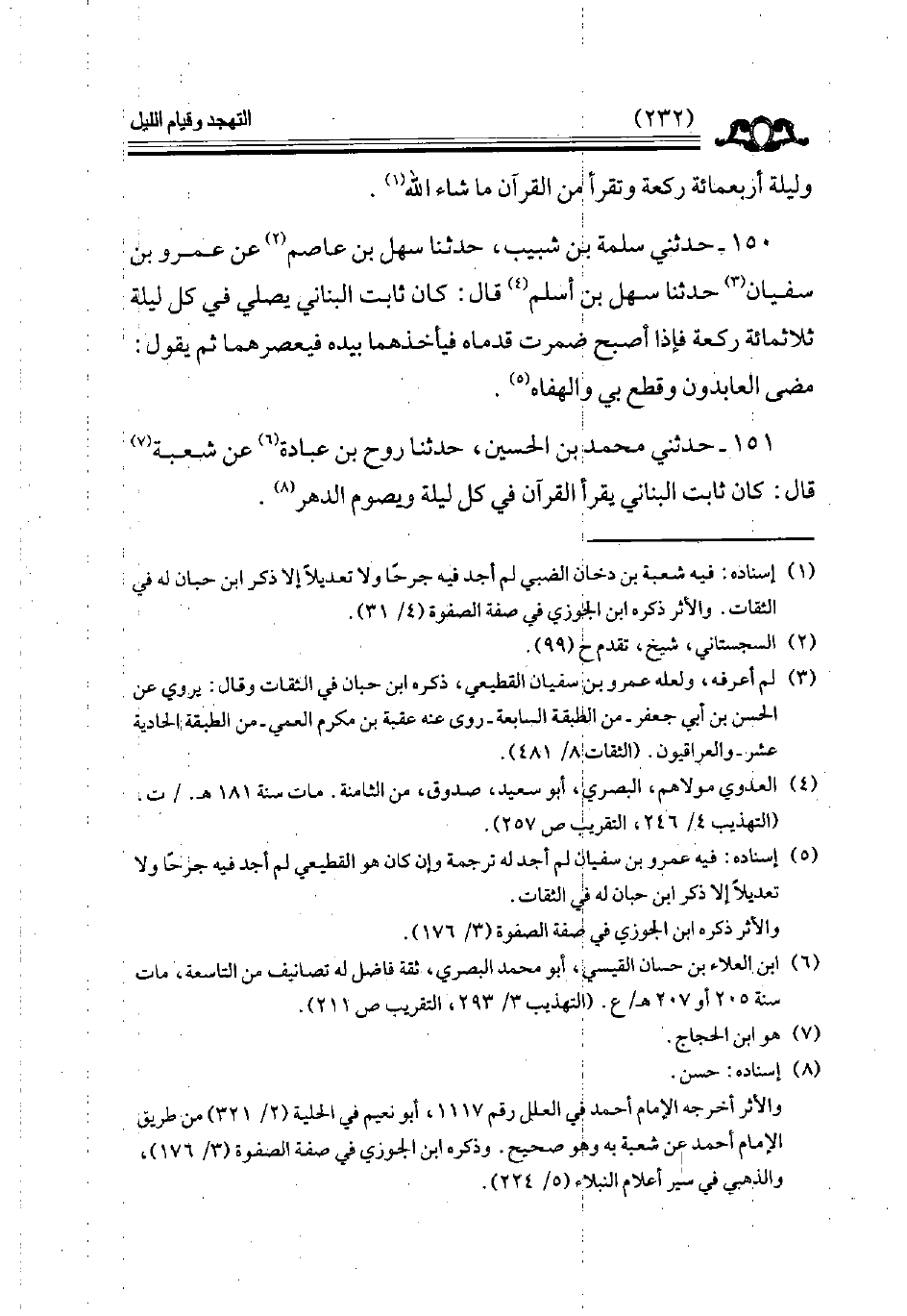 150 - حدثني سلمة بن شبيب حدثنا سهل بن عاصم عن عمرو بن سفيان حدثنا سهل بن أسلم قال كان ثابت البناني يصلي في كل ليلة ثلاثمائة ركعة فإذا أصبح ضمرت قدماه فيأخذهما بيده فيعصرهما ثم يقول مضى العابدون وقطع بي والهفاة // إسناده فيه عمرو بن سفيان لم أجد له ترجمة //