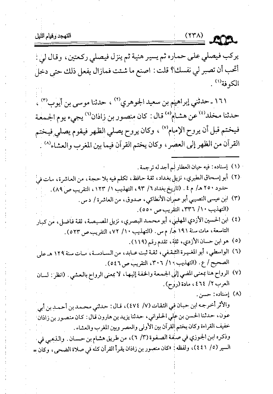 161 - حدثني إبراهيم بن سعيد الجوهري حدثنا موسى بن أيوب حدثنا مخلد عن هشام قال كان منصور بن زادان يجيء يوم الجمعة فيختم قبل أن يروح الإمام وكان يروح يصلي الظهر فيقوم فيختم القرآن من الظهر إلى العصر وكان يختم القرآن فيما بين المغرب والعشاء // إسناده حسن //