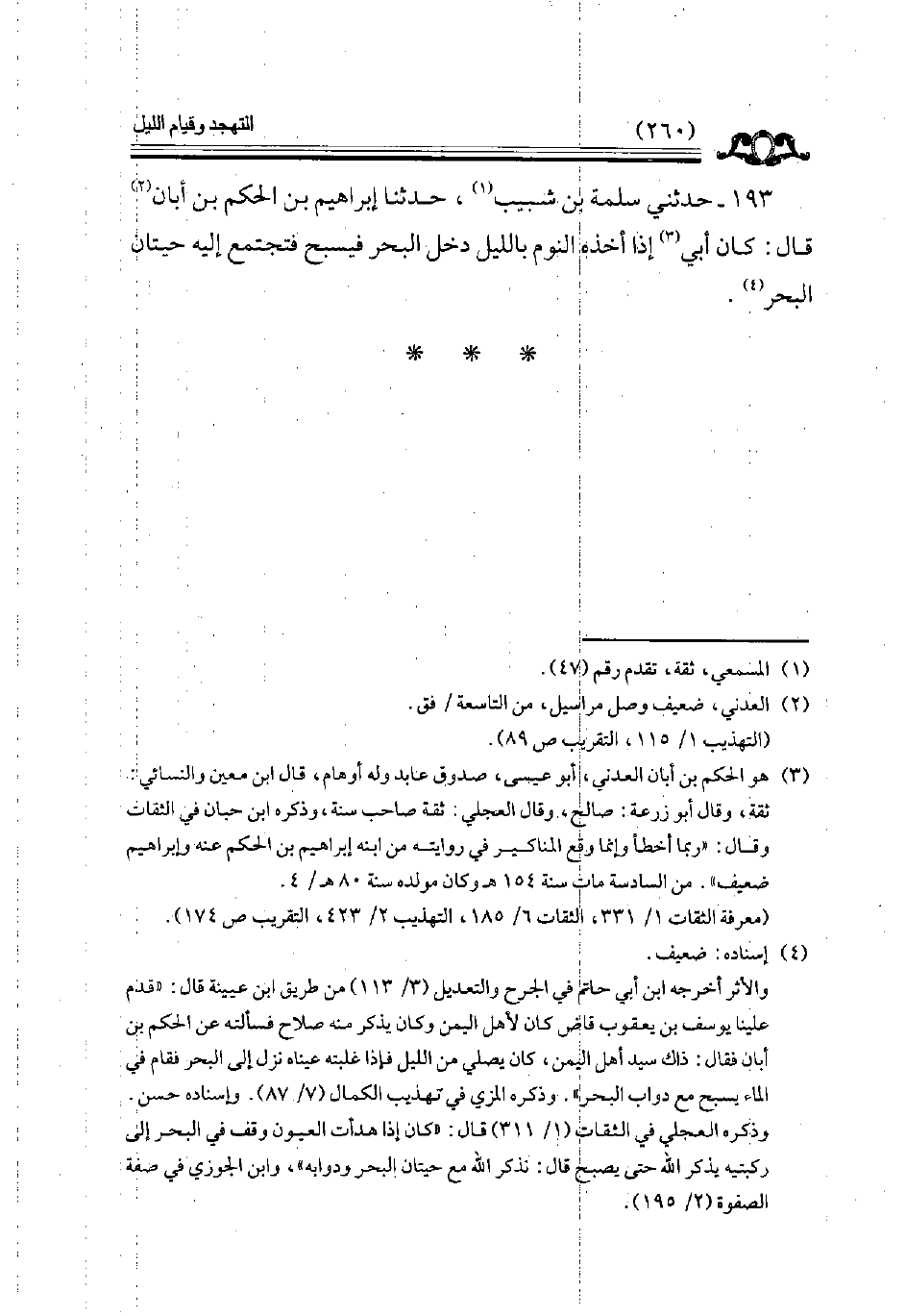 193 - حدثني سلمة بن شبيب حدثنا إبراهيم بن الحكم بن أبان قال كان أبي إذا أخذه النوم بالليل دخل البحر فيسبح فتجتمع إليه حيتان البحر // إسناده ضعيف //