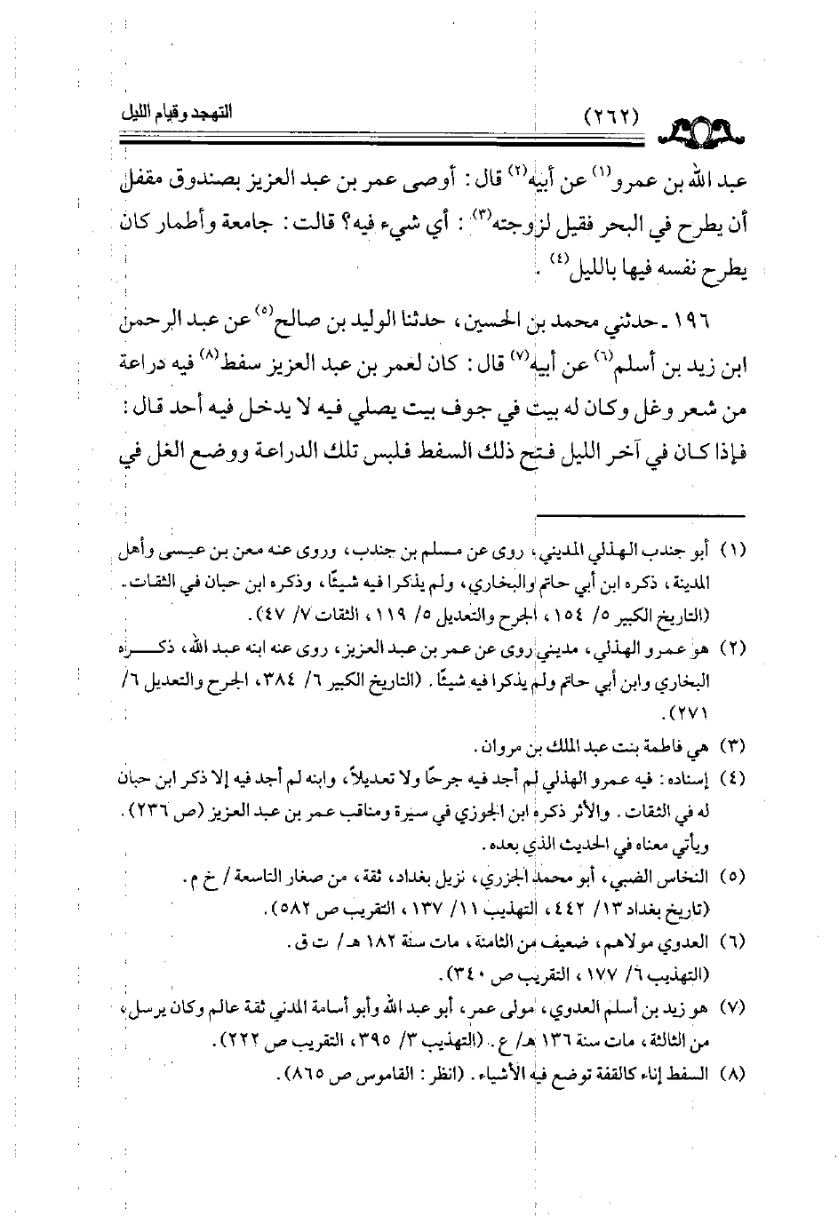 196 - حدثني محمد بن الحسين حدثنا الوليد بن صالح عن عبد الرحمن بن زيد بن أسلم عن أبيه قال كان لعمر بن عبد العزيز سفط فيه دراعة من شعر وغل وكان له بيت في جوف بيت يصلي فيه لا يدخل فيه أحد قال فإذا كان آخر الليل فتح ذلك السفط فلبس تلك الدراعة ووضع الغل في