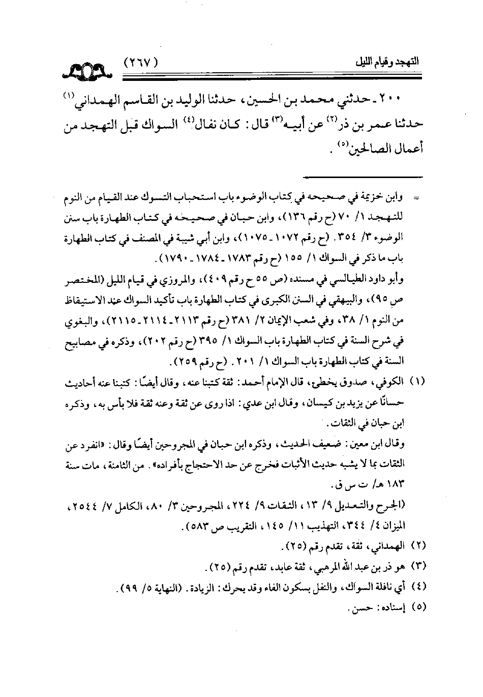 200 - حدثني محمد بن الحسين حدثنا الوليد بن القاسم الهمذاني حدثنا عمر بن ذر عن أبيه قال كان نفال السواك قبل التهجد من أعمال الصالحين // إسناده حسن //