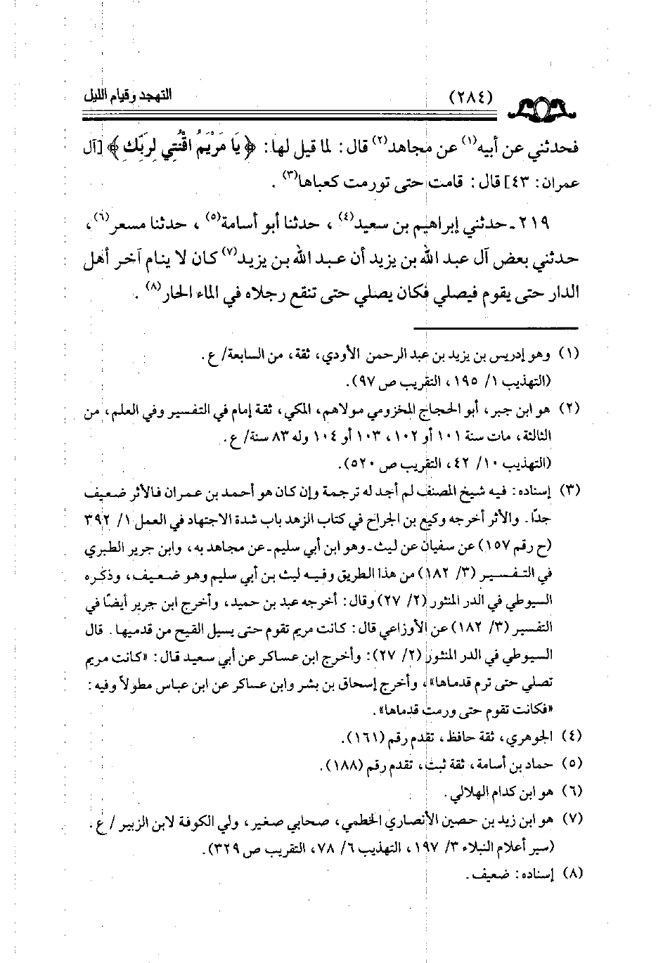 فحدثني عن أبيه عن مجاهد قال لما قيل لها ( يا مريم اقنتي لربك ) آل عمران 43 قال قامت حتى تورمت كعباها // إسناده فيه شيخ المصنف لم أجد له ترجمة //