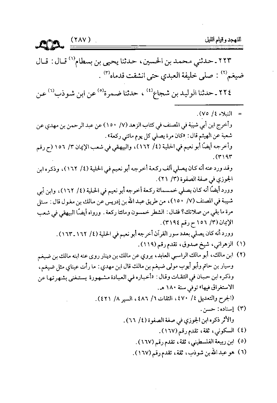 223 - حدثني محمد بن الحسين حدثنا يحيى بن بسطام قال قال ضيغم صلى خليفة العبدي حتى انشقت قدماه