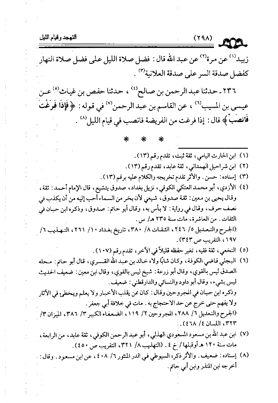 236 - حدثنا عبد الرحمن بن صالح حدثنا حفص بن غياث عن عيسى بن المسيب عن القاسم بن عبد الرحمن في قوله ( فإذا فرغت فانصب ) قال إذا فرغت من الفريضة فانصب في قيام الليل // إسناده ضعيف //