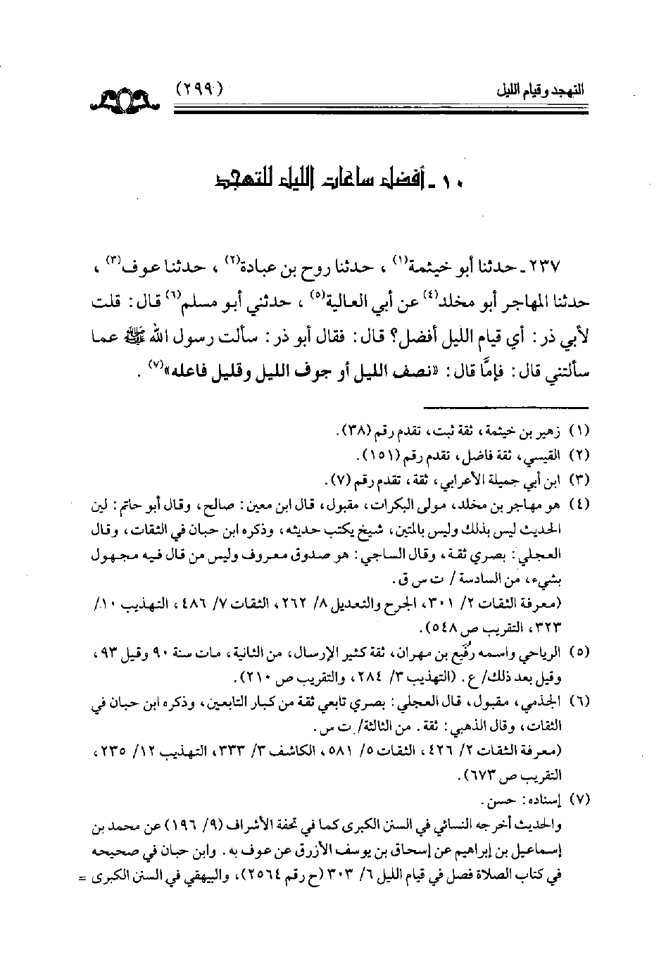 237 - حدثنا أبو خيثمة حدثنا روح بن عبادة حدثنا عوف حدثنا المهاجر أبو مخلد عن أبي العالية حدثني أبو مسلم قال قلت لأبي ذر أي قيام الليل أفضل قال فقال أبو ذر سألت رسول الله عما سألتني قال فإما قال (نصف الليل أو جوف الليل وقليل فاعله) // إسناده حسن //