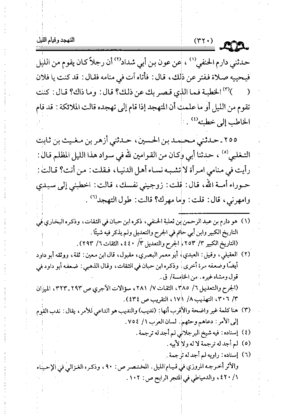 حدثني دارم الحنفي عن عون بن أبي شداد أن رجلا كان يقوم من الليل فيحييه صلاة ففتر عن ذلك قال فأتاه آت في منامه فقال قد كنت يا فلان . . . . . الخطبة فما الذي قصر بك عن ذلك قال وما ذاك قال كنت تقوم من الليل أو ما علمت أن المتهجد إذا قام إلى تهجده قالت الملائكة قد قام الخاطب إلى خطبته // إسناده فيه شيخ البرجلاني لم أجد له ترجمة //