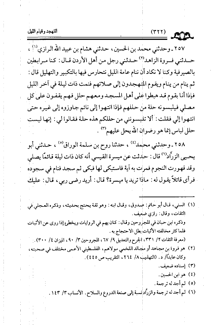 257 - حدثني محمد بن الحسين حدثني هشام بن عبيد الله الرازي حدثني فروة الزاهد حدثني رجل من أهل الأردن قال كنا مرابطين بالصيرفية وكنا لا نكاد أن ننام عامة الليل نتحارس فيها بالتكبير والتهليل قال ثم ينام من ينام ويقوم المتهجدون إلى صلاتهم فنمت ذات ليلة في آخر الليل فإذا أنا بقوم قد هبطوا على أهل المسجد ومعهم حلل فهم يقفون على كل مصلي فيلبسونه حلة من حللهم فإذا انتهوا إلى نائم جاوزوه إلى غيره حتى انتهوا إلي فقلت ألا تلبسونني من حللكم هذه حلة فقالوا لي إنها ليست حلل لباس إنما هو رضوان الله يحل عليهم // إسناده ضعيف // 3258وحدثني محمد حدثنا روح بن سلمة الوراق حدثني أبو يحيى الزراد قال حدثت عن ميسرة القيسي أنه كان ذات ليلة قائما يصلي وقد قهورت النجوم فمرت به آية فاستبكى لها فبكى ثم سجد فنام في سجوده فرأى قائلا يقول له ماذا تريد يا ميسرة قال أريد رضى ربي قال عليك